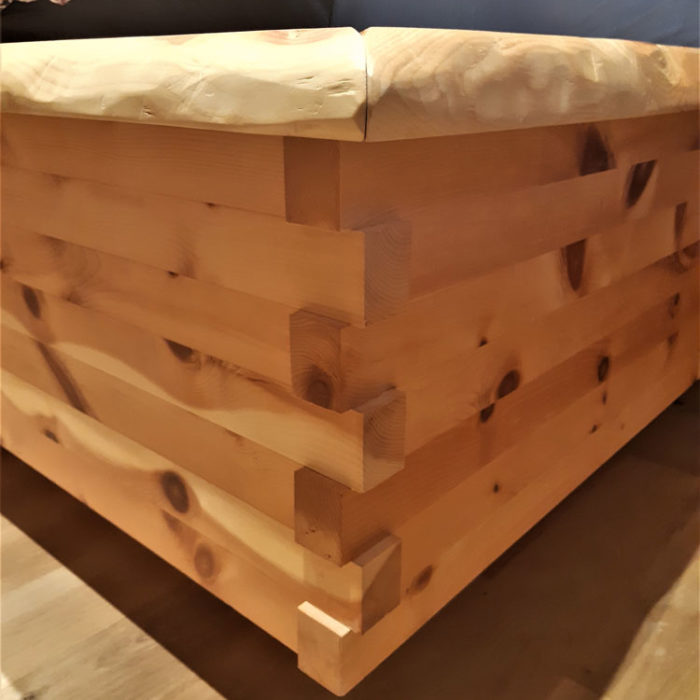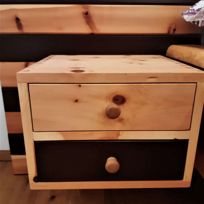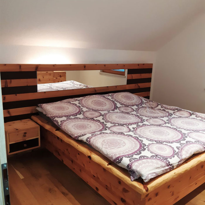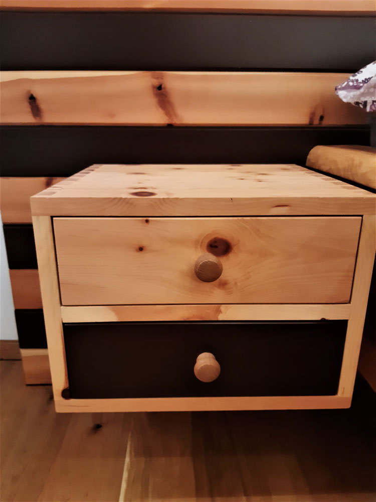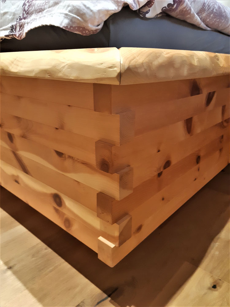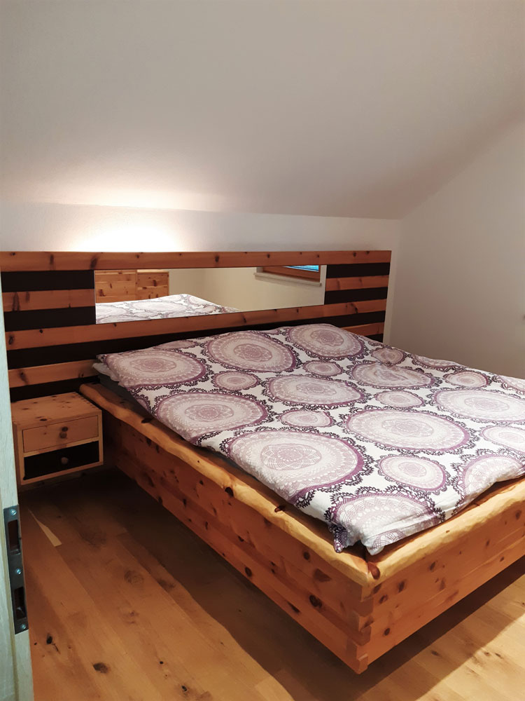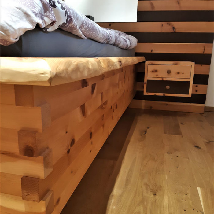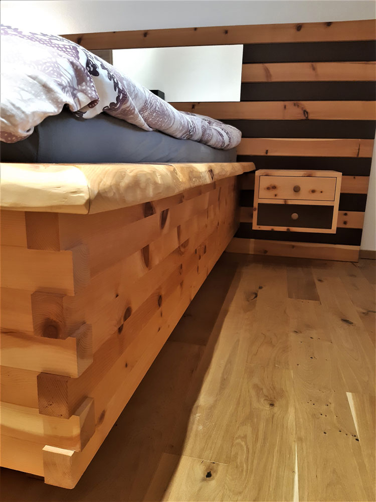 Hier wurde für einen Kunden ein modernes Zirbenbett mit Nachtkästchen in Streifenoptik hergestellt. Es handelt sich um ein metallfreies Schlafzimmer, da es mit Schwalbenschwanz gezinkt wurde und somit keine Schrauben oder Nägel verwendet wurden.