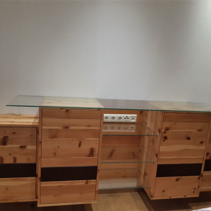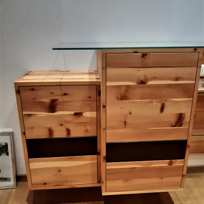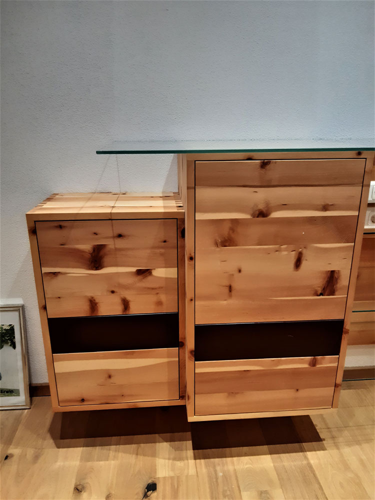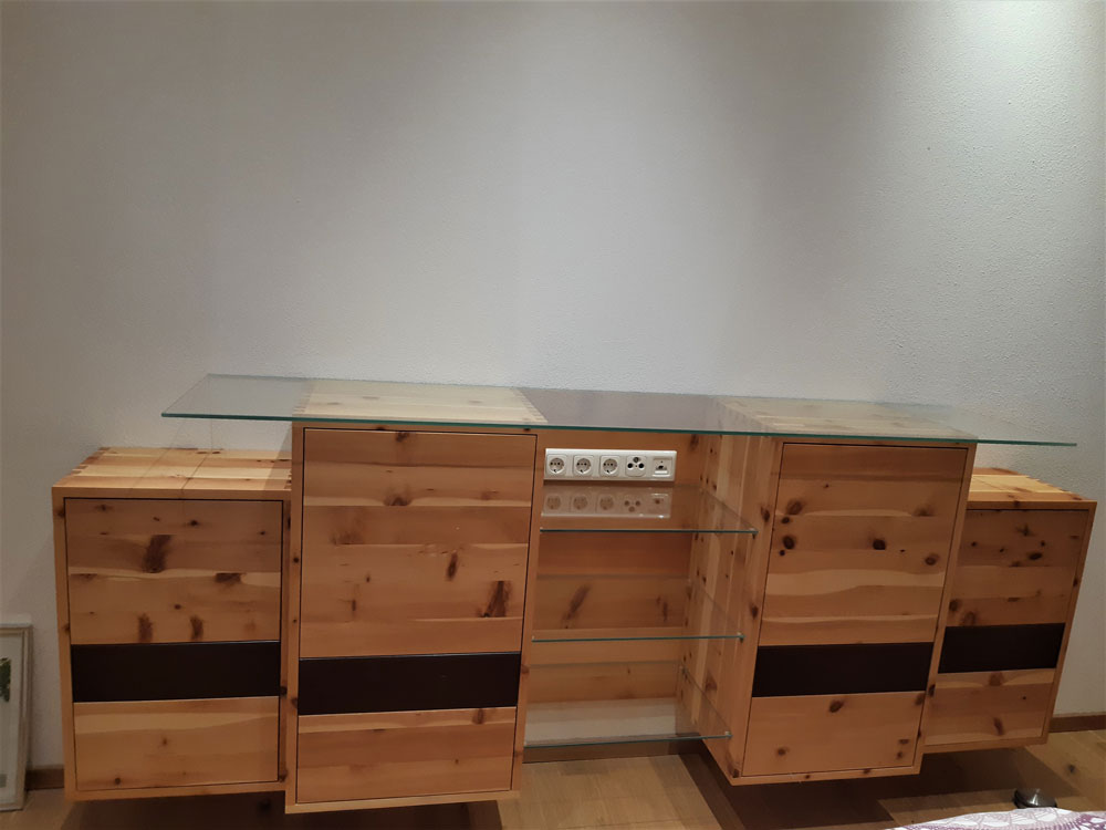 Das dazu passende Side Board ist auch aus Zirbenholz. Teile sind deckend mit rot-braunem biologischen Lack versiegelt. Ein Schlafzimmer ohne Metall maximiert Ihren Schlafkomfort.