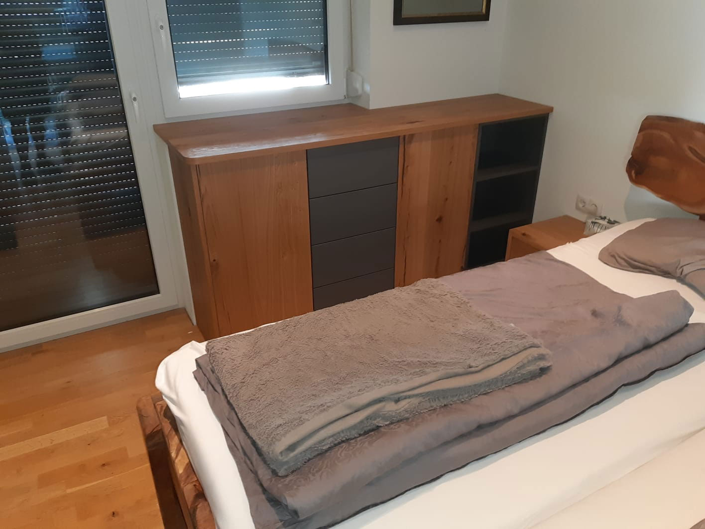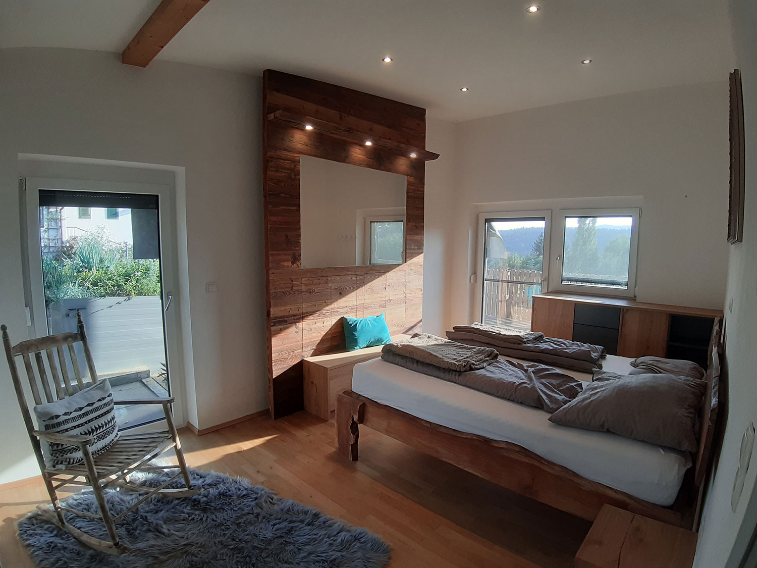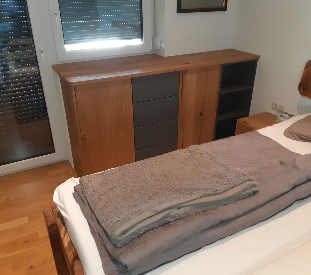 Moderne Gestaltung eines Schlafzimmers bestehend aus einem Verbau aus Altholz mit verspiegeltem Fernseher, einem Sideboard, zwei Nachtkästen und einem Bett aus Wildeiche.