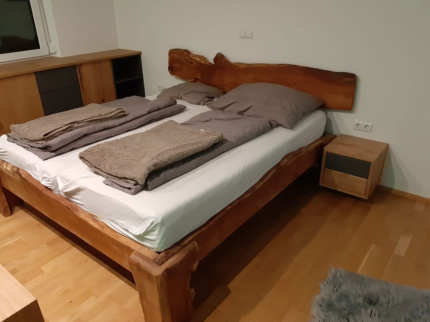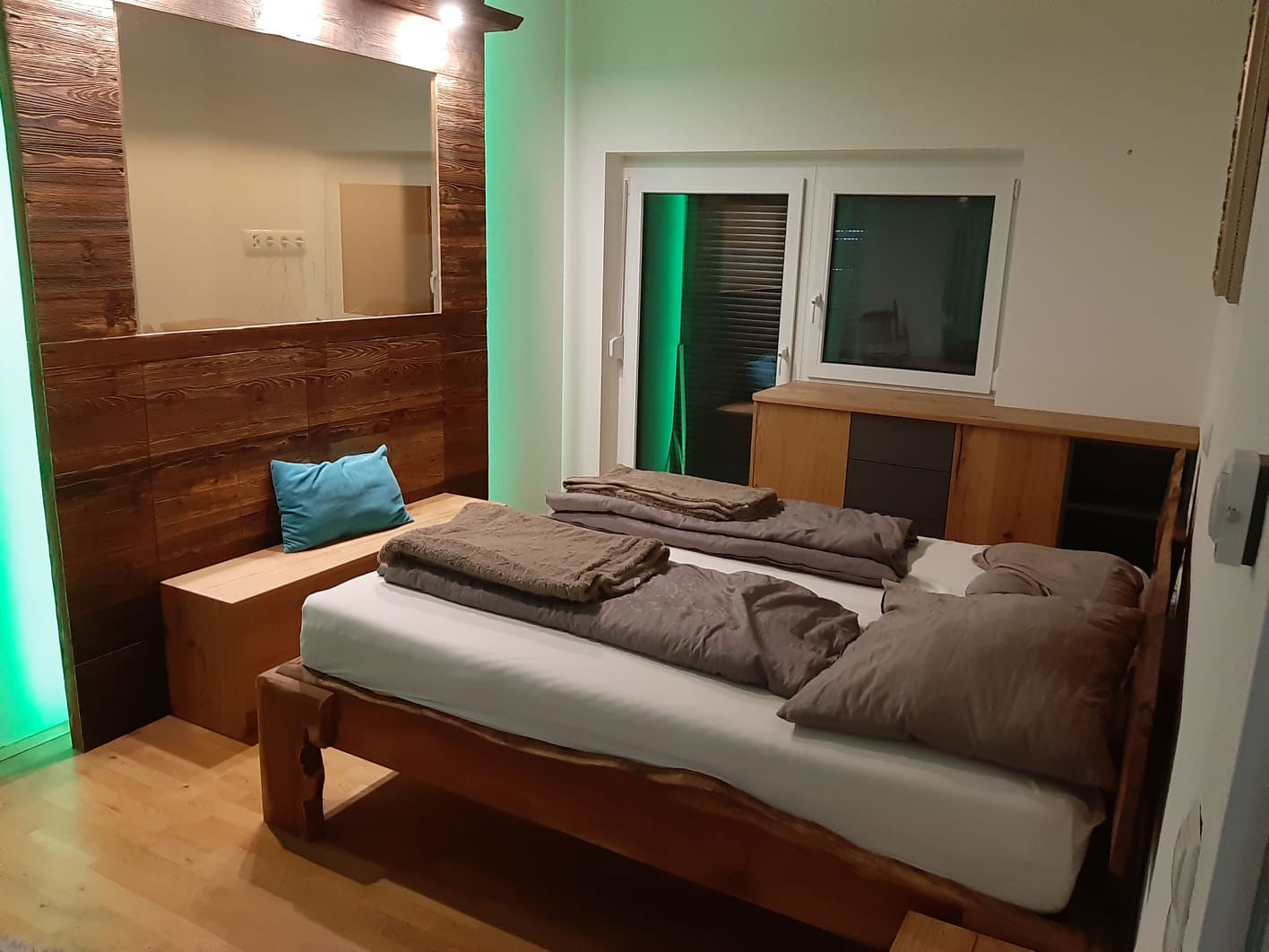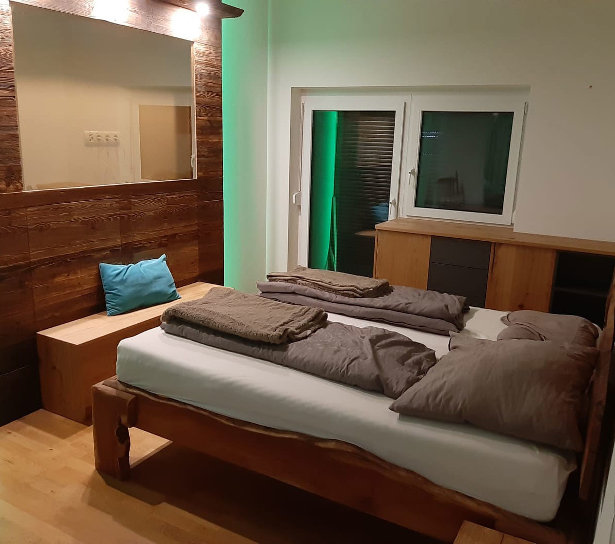 Moderne Gestaltung eines Schlafzimmers bestehend aus einem Verbau aus Altholz mit verspiegeltem Fernseher, einem Sideboard, zwei Nachtkästen und einem Bett aus Wildeiche.
