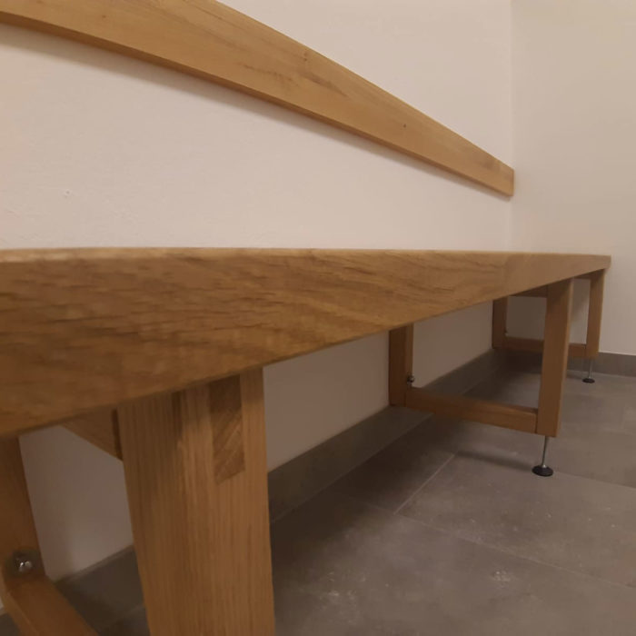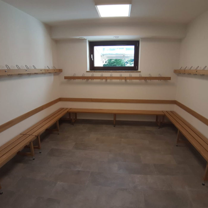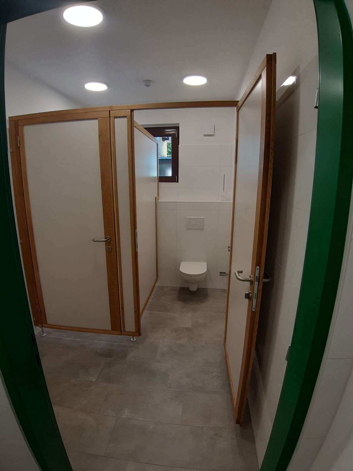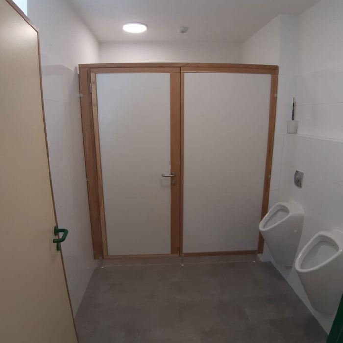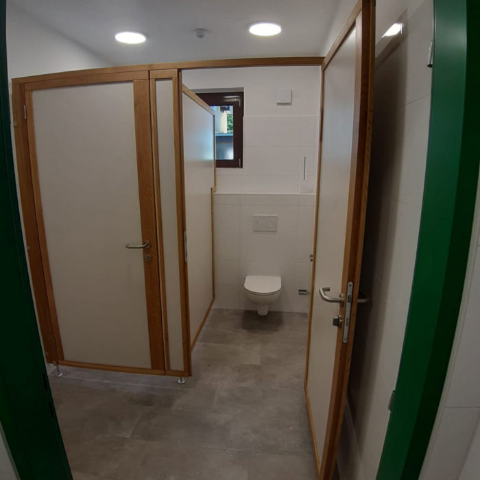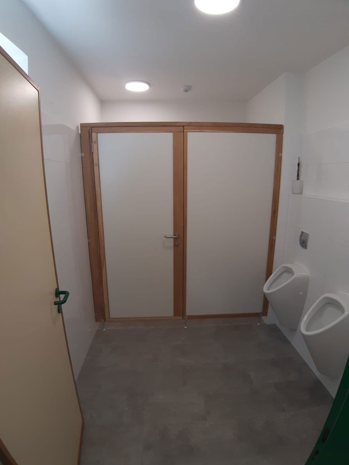 Neugestaltung von WC-Trennwänden mit Vollholzkonstruktion und Vollholztüren. Zusätzlich wurde der gesamte Garderobenbereich mit maßgeschneiderten Sitz- und Aufhängmöglichkeiten für Schülerinnen und Schüler aus robusten und langlebigen Materialien neu erstellt.
